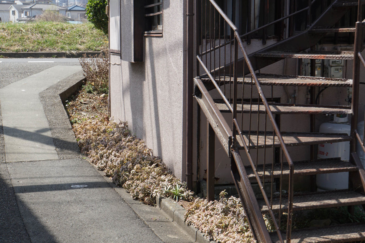 浅川に面したアパートの縁には多肉植物の「朧月」が砂色の葉を広げている。不思議なことに、砂を含んだリシンが吹き付けられたアパートの外壁も同じ色をしている。砂を構成する透明な石英の破片は不規則に並ぶことで光を錯乱させ「砂色」として見える。朧月の葉もまた、ワックスやトリコームで光を錯乱させ、太陽光から身を守っている。すべての水を蒸発させようとする太陽に対抗するように、肉厚の葉は内部に水分を滞留させている。一方で、蒸発してしまった水は雨となって地上に戻り、浅川を流れて砂を運び、この土地を形作っている。川辺の緑たちは太陽が発する凶暴な緑の電磁波をはね返すことで、かろうじて身を守っている。